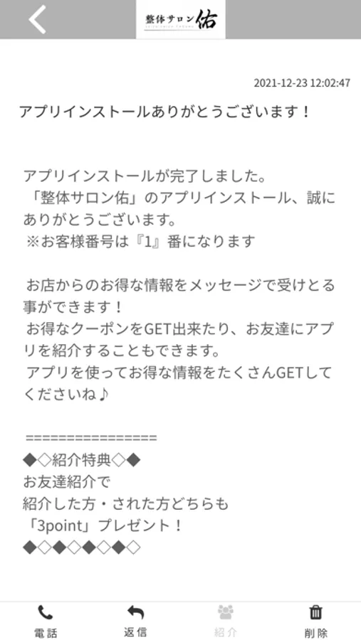 整体サロン佑のアプリをSNSを通じてお友達に紹介する事ができます。