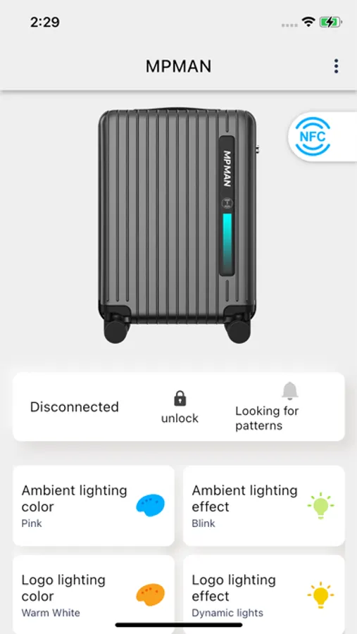 MPMAN APP is the control software of the smart riding suitcase, which can be wirelessly interconnected with the smart luggage; it controls the lighting effects and light color of the smart luggage, and adjusts the speed according to user needs, etc., to enrich your fun experience.
