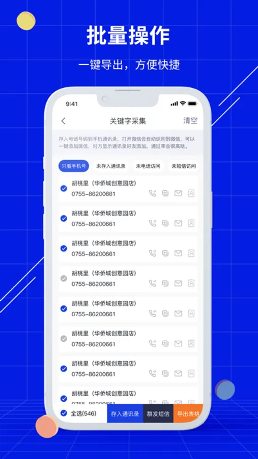【批量导出信息】采集到的信息支持导出联系人至手机通讯录,自动识别微