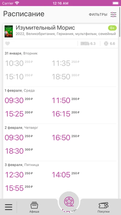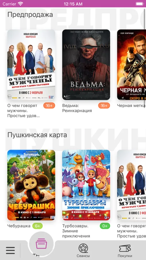 - узнавать расписание сеансов и цены на билеты