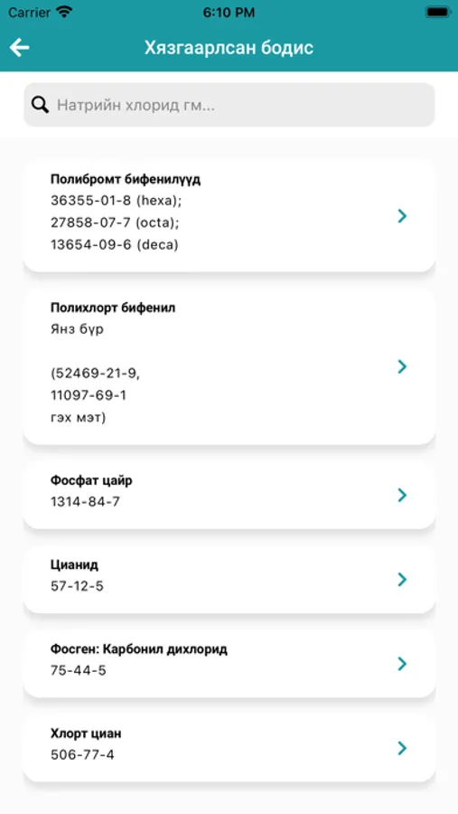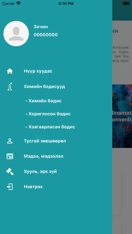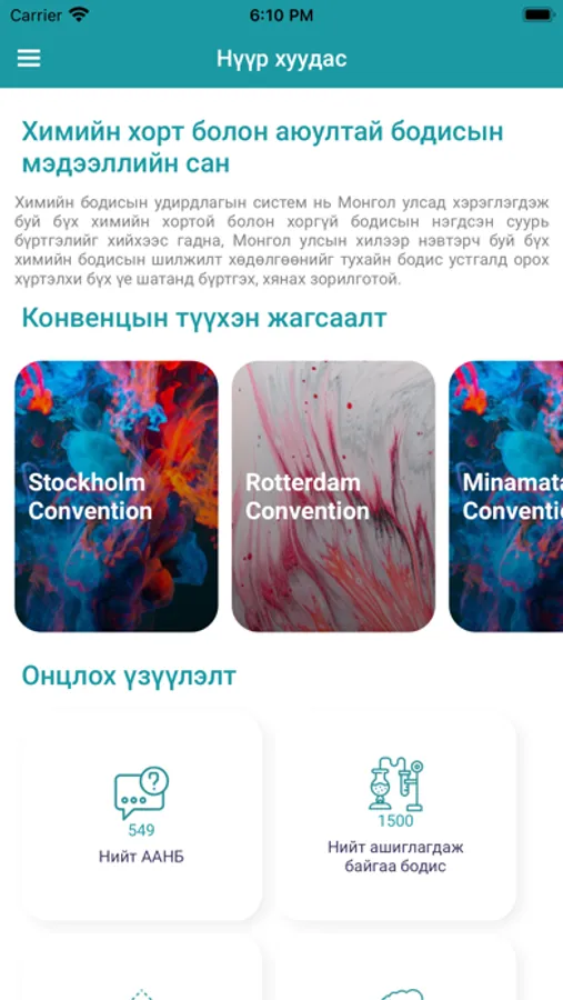 Энэхүү апплейкшн нь Монгол улсад ашиглахыг зөвшөөрсөн, хориглосон, хязгаарласан химийн хорт болон аюултай бодисын бүртгэл, эдгээр бодисыг экспортлох, импортлох, хил дамжуулан тээвэрлэх, үйлдвэрлэх, худалдах, ашиглах тусгай зөвшөөрөл бүхий ААНБ-уудын мэдээлэл, уг салбарт холбоотой мэдээ мэдээллийг агуулсан болно.