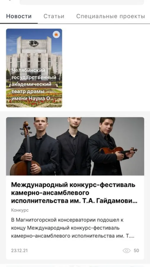 Также в приложении вы найдете информацию о значимых культурных местах Челябинской области, прочитаете рецензии от экспертов в искусстве, интервью с людьми из мира культуры и узнаете мнения других пользователей обо всех культурных событиях в регионе. Кроме того, приложение дает возможность смотреть прямые трансляции с мероприятий.