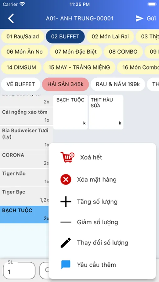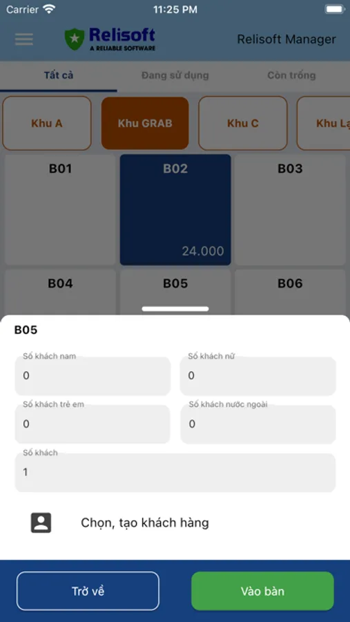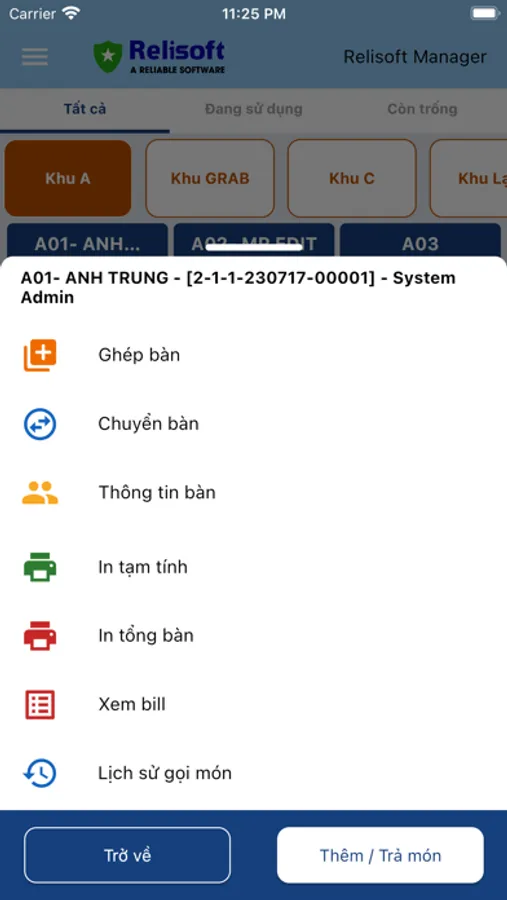 + Các thao tác bàn bao gồm: chuyển bàn, ghép bàn, gửi lệnh in tạm tính.