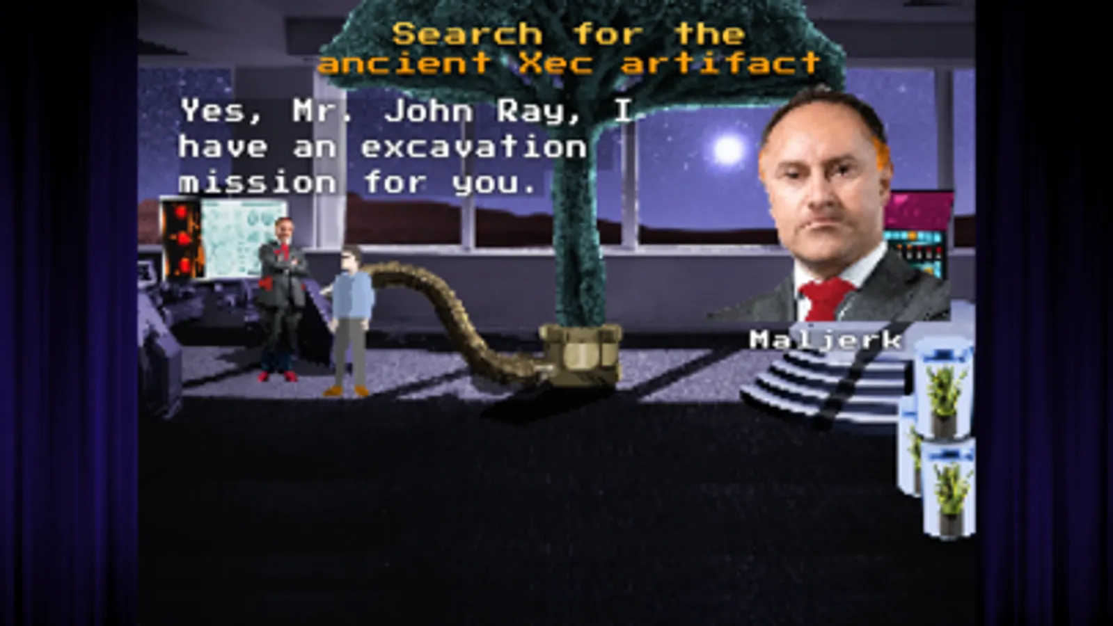 A retro point and click adventure game about John Ray, a space archaeologist, under contract by the wealthy Mr. Maljerk. John's adventure begins with the search for ancient artifacts scattered throughout the local star system. These artifacts are part of a powerful device left by a technologically advanced but mostly forgotten Xec race.