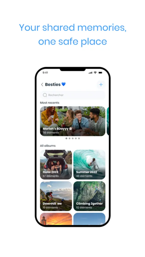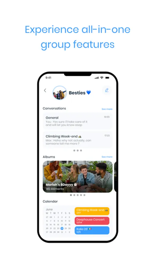 Albums - Preserve all your group memories in dedicated albums. All members can add photos and videos, comment on them, and react to others'.