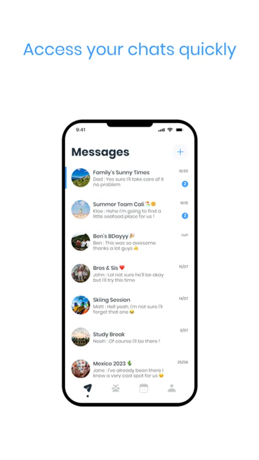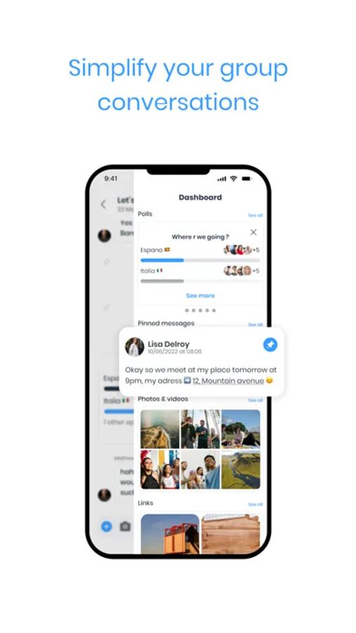 Messages - Take advantage of a messaging system optimized for groups. Pinned messages, polls, shared links, and documents are easily accessible, making group organization a breeze.