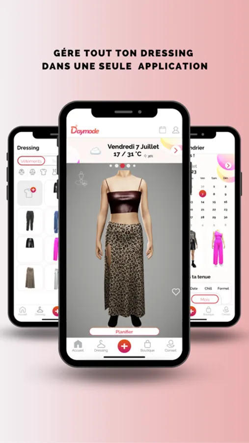 Grâce à notre technologie 3D, tu peux visualiser tous tes vêtements directement sur ton téléphone. Il te suffit de les enregistrer dans l'application et tu auras accès à des suggestions de tenues en quelques secondes. Que tu cherches une tenue pour une soirée, une réunion importante ou simplement une journée décontractée, Daymode te propose des options pour toutes les occasions. Et avec des conseils de mode personnalisés, tu peux être sûr(e) de porter des tenues qui te mettent en valeur.