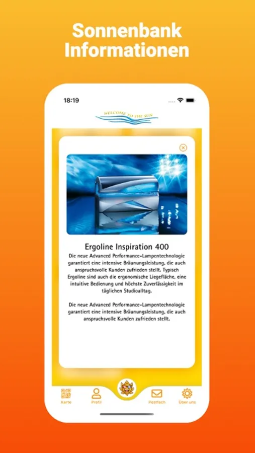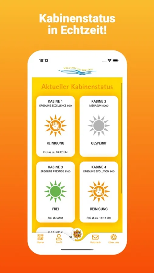 Die App bietet dir neben aktuellen Angeboten, Öffnungszeiten, Aktionen und Informationen, auch den augenblicklichen Kabinenstatus in Echtzeit, von deiner Welcome to the Sun. Somit weißt du immer, ob, oder wie lange, deine Lieblings-Sonnenbank noch läuft.