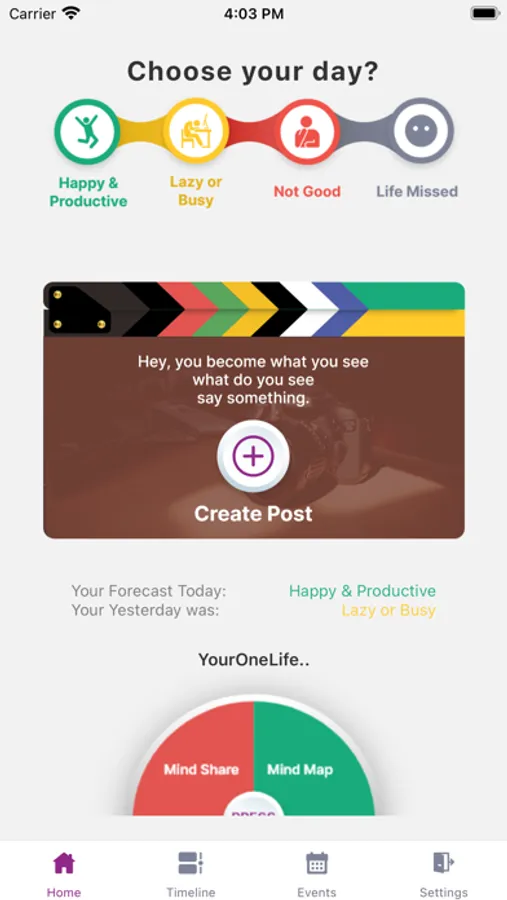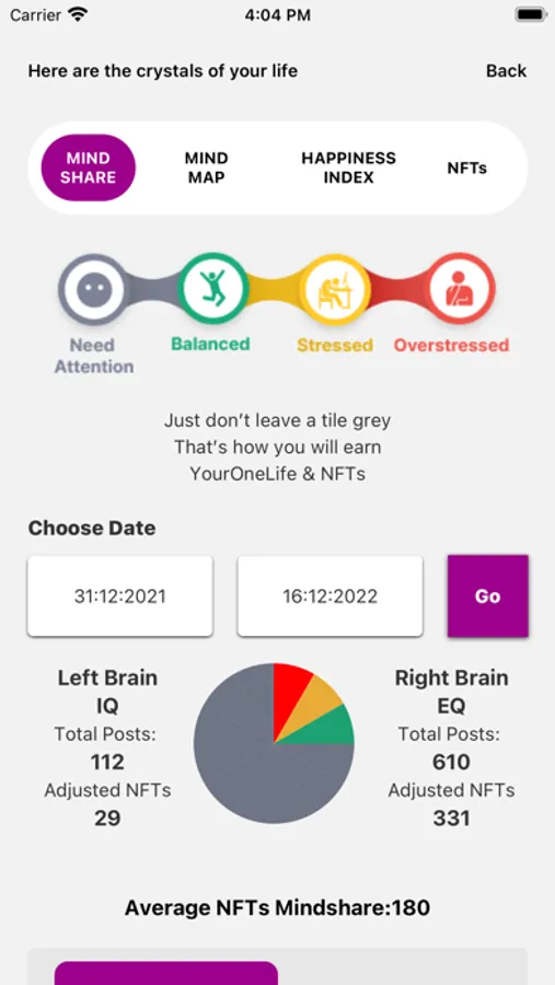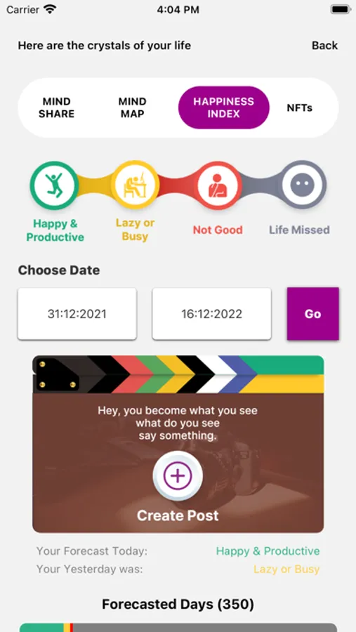 The app is a fun filled journey that encourages the individual to update aspects looking at the frame of each aspect in green, yellow, red and grey colors. While this is the mindshare aspect of the app... it has two other interesting features: Mind-map and happiness index. Mind-map refers to the total posts updated under any one aspect as a percentage of total updates for any given time period: thus family was 20 posts out of 800 posts or only 5% of the mindmap. The happiness index is the difference between forecasted happiness and real happiness then that is computed by asking the individual two pertinent questions each morning: "How was your yesterday?" and "What is your forecast for today?" the variance between these two then is calculated as the stress or distance from happiness.