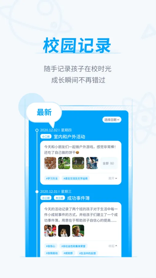 运用文字、图片、视频多元化方式随时随地记录幼儿在园所的成长表现,自动生成电子化成长报告,使观察真实、客观,易于记忆,儿童过程性成长数据一目了然。