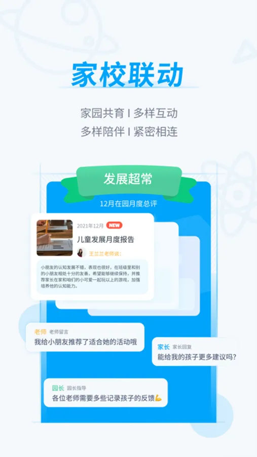 通过线上孩子成长信息同步,线下教育指导同频,降低家园沟通成本,增强家园有效沟通,让老师工作更省时省心省力。通过智能化推荐在家亲子活动、面向家庭的学习和活动资源,让家长参与进来,整合孩子的家庭观察和在园表现,双向交流,家园联动,共促儿童能力全面发展。