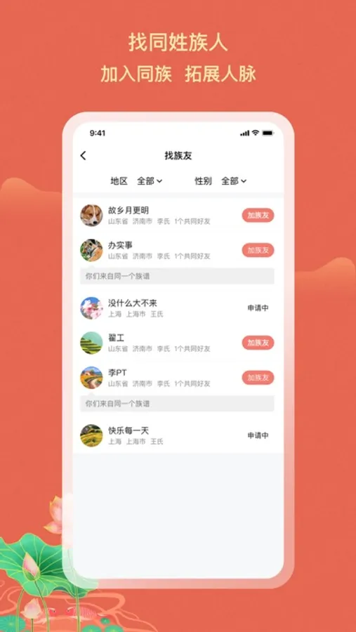你可以通过自己的姓氏为创建族谱,并邀请家人、亲友加入进来,共同完善族谱,通过族谱树能清晰直观的展示出您的家族关系,也能通过家族动态及时的了解家族内成员的近期动态与活动