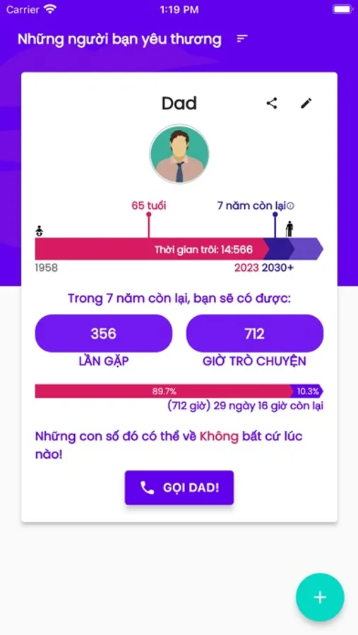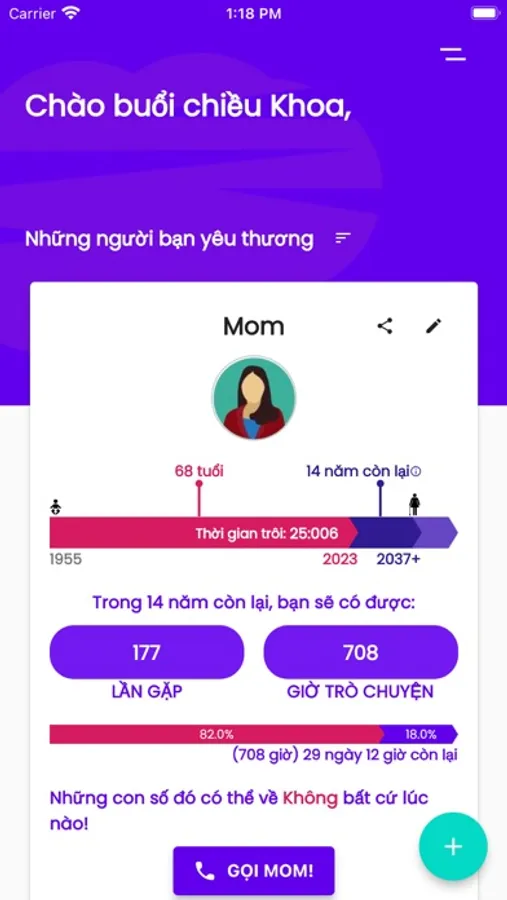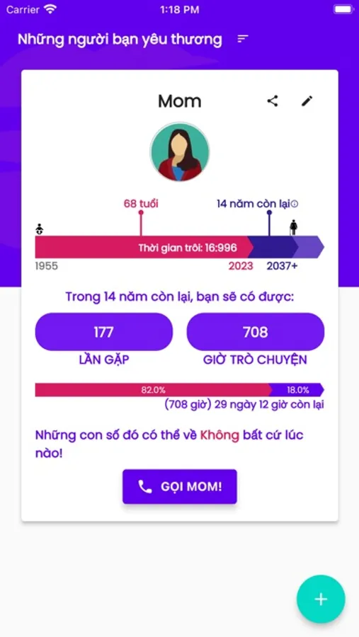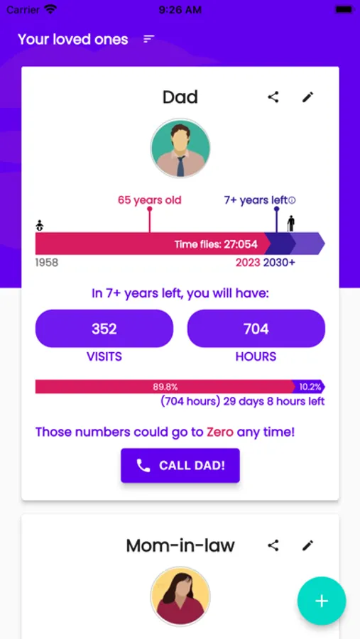You input the estimated number of visits and hours that you plan to spend with your loved ones. Based on the average age of your loved ones, we’ll calculate the remaining visits and hours that you could visit/talk to your loved ones. Those numbers could be surprisingly small and that makes you aware of the time that you spend with your loved ones.