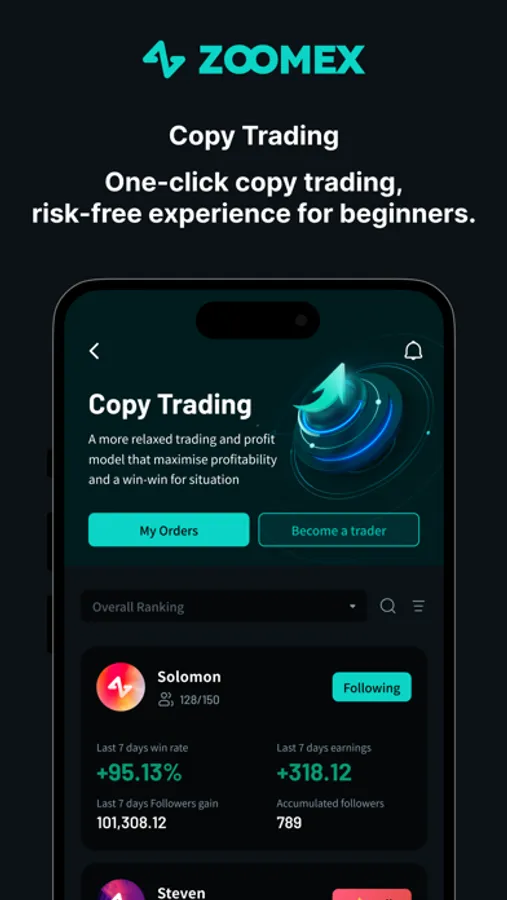 We provide users with the most user-friendly copy trading feature. Copy Trading allows users to follow professional traders worldwide. We recommend this feature for new users entering the world of digital asset trading, providing a zero-barrier, risk-free trading experience.