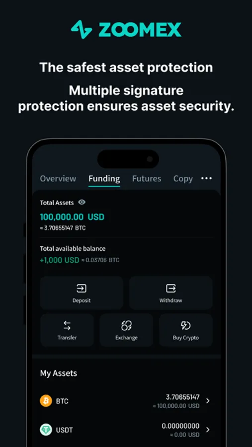 Security is our top priority. ZOOMEX uses a multi-signature cold/hot wallet system as a financial asset protection system.