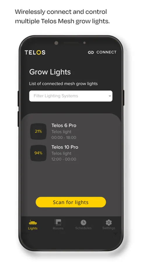 The Telos Mesh app allows you to wirelessly connect and control up to several hundred Growcast or Telos LED systems from a single smart device and brings revolutionary new functionality to growers using Bluetooth mesh technology. The app has been designed to be secure and all commands are encrypted. Once your lights are connected, you can enable Privacy Lock mode to hide the network and make it completely invisible to anyone searching for a Bluetooth network.