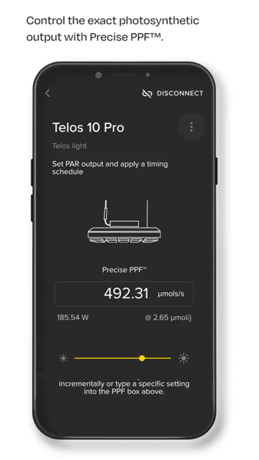 Telos Mesh gives you precise control over the PPF output of your Telos LED. You can use the scroll bar to adjust the output from 0-100% or directly enter the desired PPF level into the app. Compared with fixed increments on traditional dimmers, using Telos Mesh you can set the exact PPF level to suit the plant and grow area for amazing repeatable results.