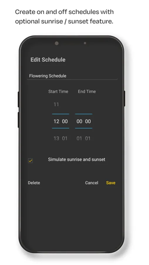 You can easily create and apply schedules to single lights or groups of lights and get rid of mechanical timers once and for all. The optional sunrise and sunset mode helps to ease the plants transition between light and dark periods. The app displays all the key information on the grow lights page so you know exactly what is happening without having to open the grow tent.