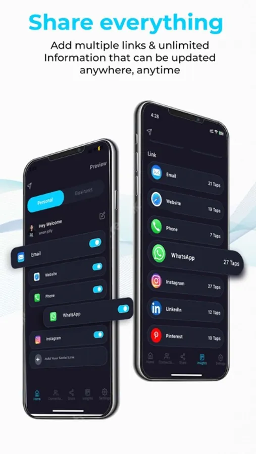 Add everything you would like to share with your connections, including multiple links to your social handles, business and contact information, location, website, catalogue, and anything else you feel is relevant to share, all in one place.
