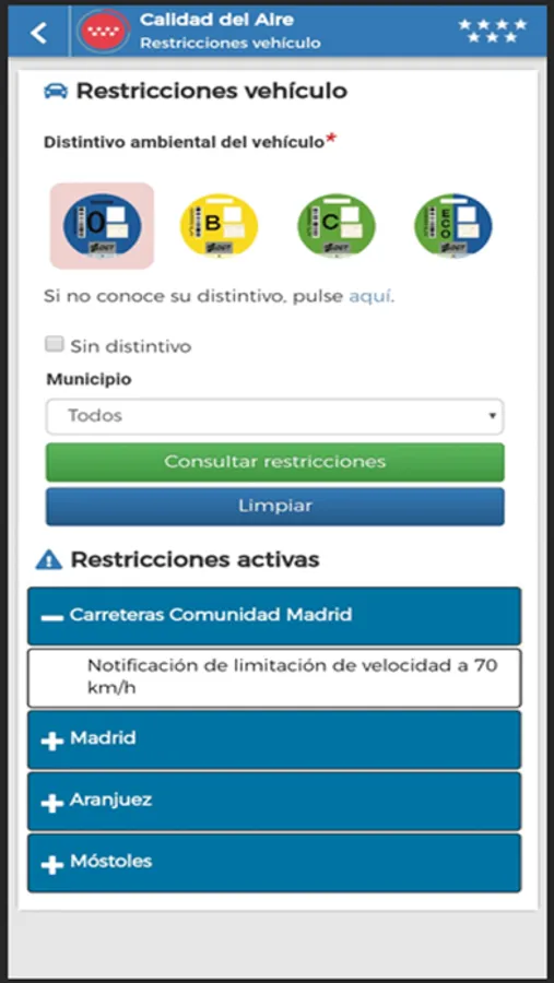 También recibir notificaciones de cualquier tipo de Aviso que se produce en la Red de Calidad del Aire de la CM así como información de los diferentes Escenarios y Medidas de tráfico adoptadas por los Municipios.