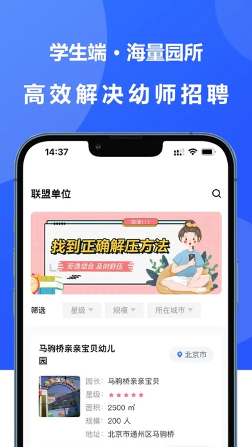 中贝未来APP学生端,专注学前教育互联网领域,依托中贝未来学前教育学院,专注学前教育幼师实习,就业10余年,实习就业稳定; 降低实习就业试错率;海量幼儿园及实习就业单位真实安全;严格标准联盟机制,双管模式,职业定位更精准;保薪赋能,节省成本 ; 增加收入; 岗薪同行;幼教,实习老师专属求职平台;学习,实习工具。