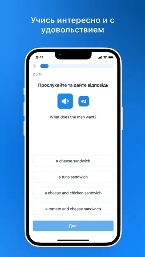 • Проходи разные типы заданий, составленные квалифицированным специалистом, такие как: перевод текста с русского на английский и наоборот, перевод аудиозаписи, нахождение пар между словами, ответы на вопросы и многое другое.