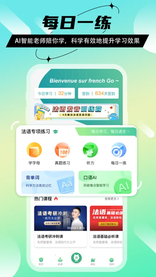 法语GO,帮助法语学习爱好者,零基础入门轻松学法语。为法语各阶段学习量身打造的学习软件。