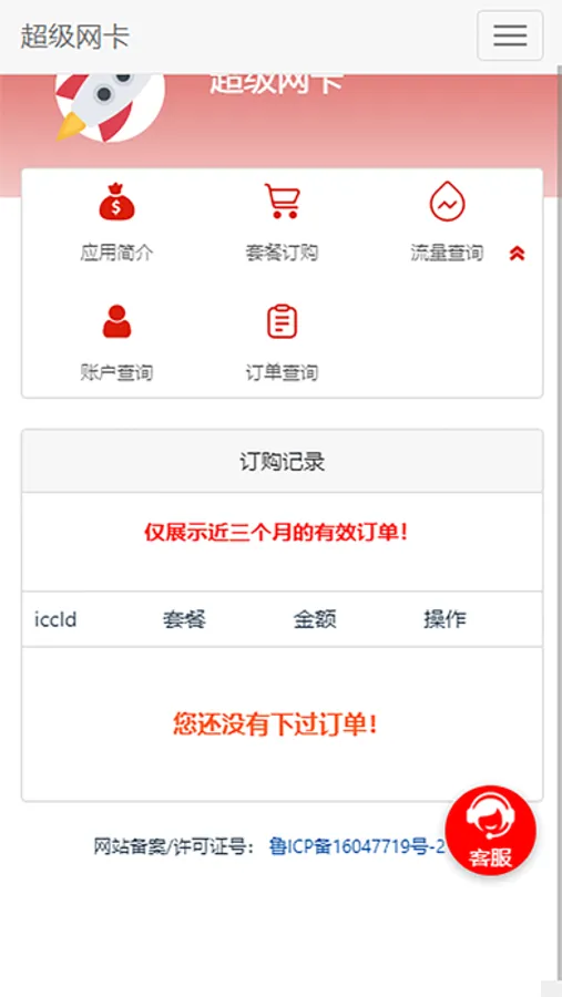 本APP为网卡用户管理系统。主要的应用功能有:套餐订购(客户可以根据自己的需求,购买适合自己的流量套餐)、流量查询(查询网卡的流量使用情况,方便客户管理)、账户查询(客户查询账户级别信息,包括用户名、卡内余额、ICCID等信息)、订单查询(查询客户的订单基础信息)。