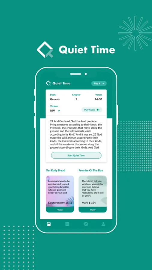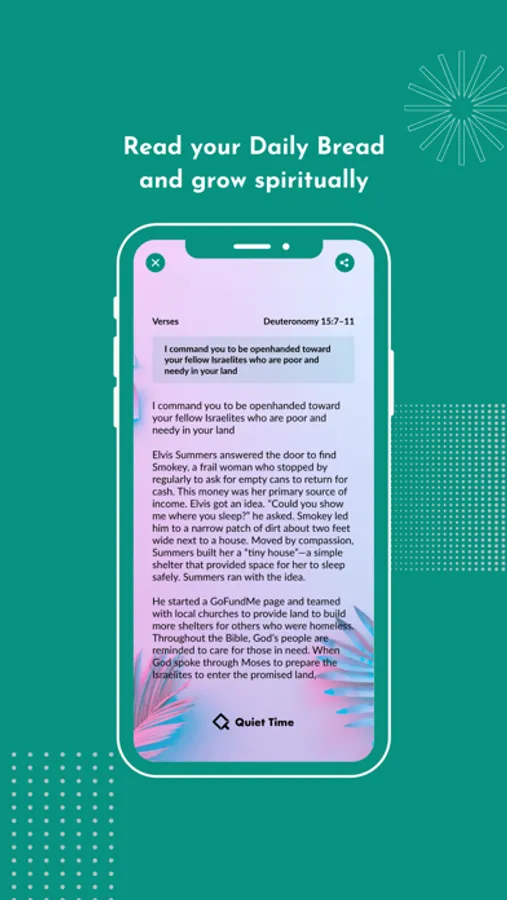 Spend quality time with God everyday with Quiet Time. Grow spiritually with Daily Bread and know Promises of God in your life through Promises of the day. Read Christian related articles about various topics and submit and pray for pray requests of the community.