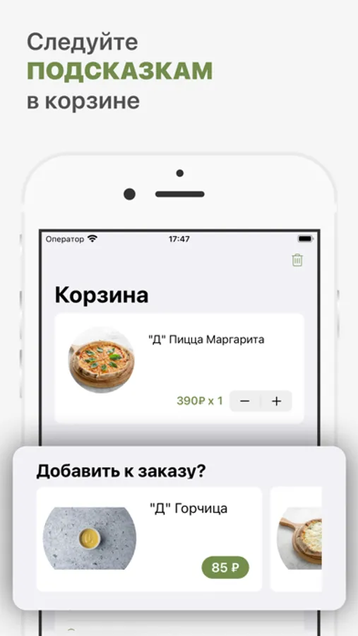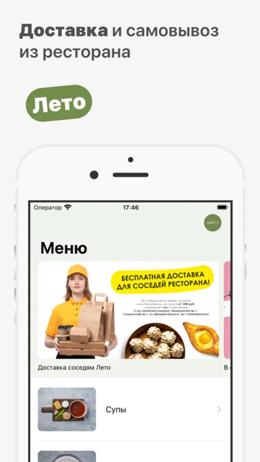 Как сделать заказ в приложении “Лето”: выберите понравившиеся позиции из меню, добавьте их в корзину и перейдите на экран оформления заказа (по нажатию на иконку корзины).