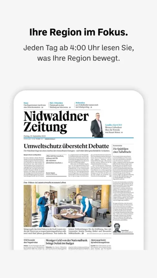 Die «Nidwaldner Zeitung» steht täglich bereits ab 4 Uhr morgens in der E-Paper-App bereit. Die Ausgabe wird wahlweise automatisch oder manuell heruntergeladen. Sobald die aktuelle Ausgabe heruntergeladen ist, lesen Sie diese auch ohne Internetverbindung, zuhause oder unterwegs.