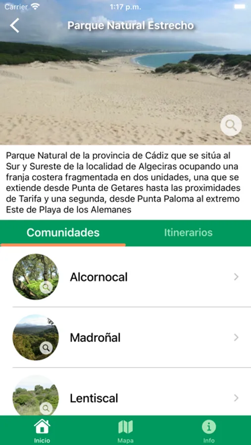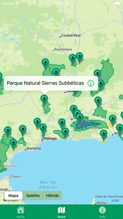 El acceso a toda la información (comunidades vegetales y rutas didácticas) se realiza desde un mapa en el que aparecen cartografiados diferentes espacios naturales de Andalucía (Parques Nacionales, Parques Naturales, Parajes Naturales y Monumentos Naturales).