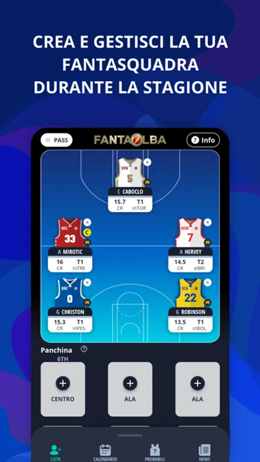 1) Squadra: hai 95 crediti per selezionare il tuo roster composto da: 2 centri, 4 guardie, 4 ali e 1 allenatore.