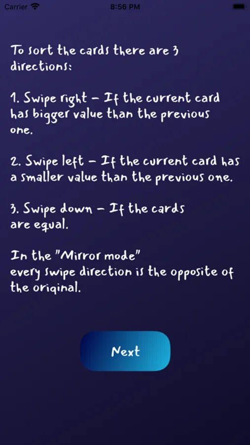 If you like brain training games you are at the right place. In this game you must think fast and have quick reflexes. The game consists of 42 levels. In each level there will be a number of cards which you need to sort. In each card you must calculate a simple arithmetic operation between a number and an image (representing a number which you must guess). When you make the calculation, in order to sort the card you have to compare the value of the current card with the value of the previous one, so you always need to remember the value of the previous card. To sort the cards there are 3 directions: