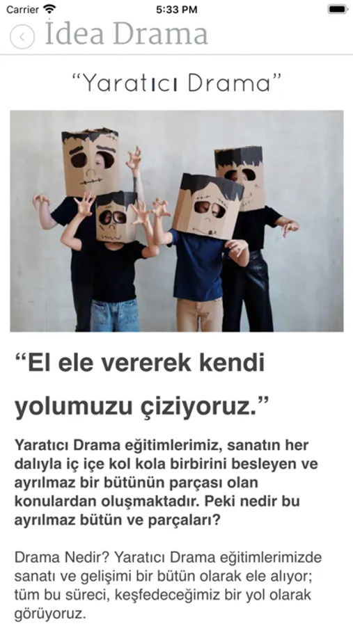 Yaratıcı Drama Uygulaması Gerçek dünya deneyimleriyle hayal gücünü bir araya getirir. Düşüncelerin yazılı ve sözlü anlatımında gelişme sağlar. Yaratıcı Drama Uygulaması, bireyin içinde var olan yetenekleri ortaya çıkarmanın en önemli zeminidir.
