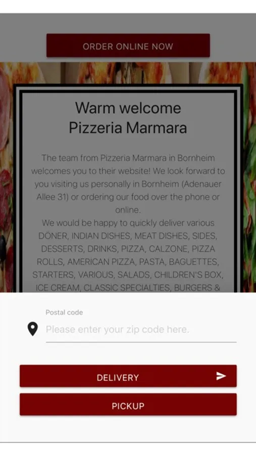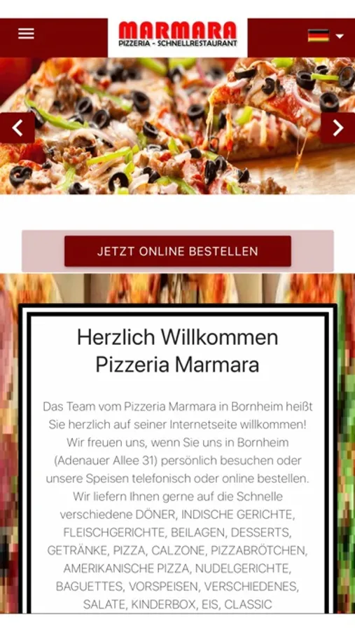 Das Team vom Pizzeria Marmara in Bornheim heißt Sie herzlich auf seiner Internetseite willkommen! Wir freuen uns, wenn Sie uns in Bornheim (Adenauer Allee 31) persönlich besuchen oder unsere Speisen telefonisch oder online bestellen.