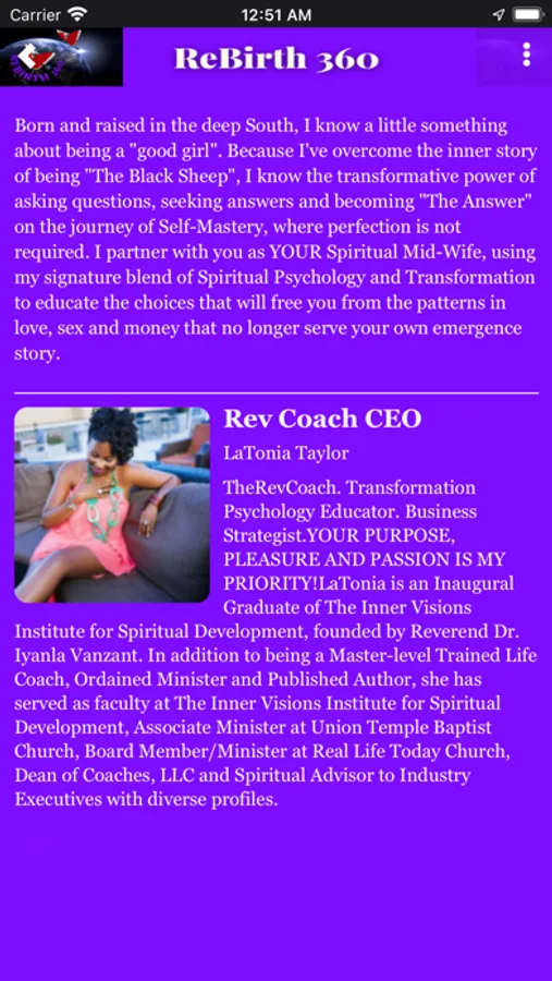ReBirth 360 app contains ministry, teachings, audios, ebooks from the Rev Coach Ceo LaTonia Taylor, the Priestess of Purpose, Pleasure, Passion and Profits.