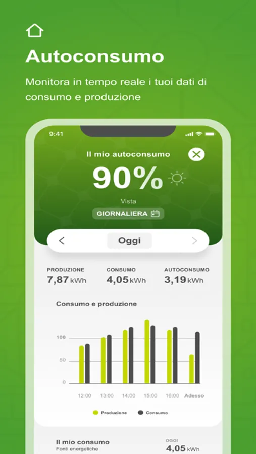 Con l’app Edison My Sun puoi monitorare il tuo impianto fotovoltaico in tempo reale. Attraverso dei semplici grafici puoi monitorare l’energia prodotta dal tuo impianto, l’energia prelevata dalla rete o immessa in rete e il consumo totale della tua abitazione.
