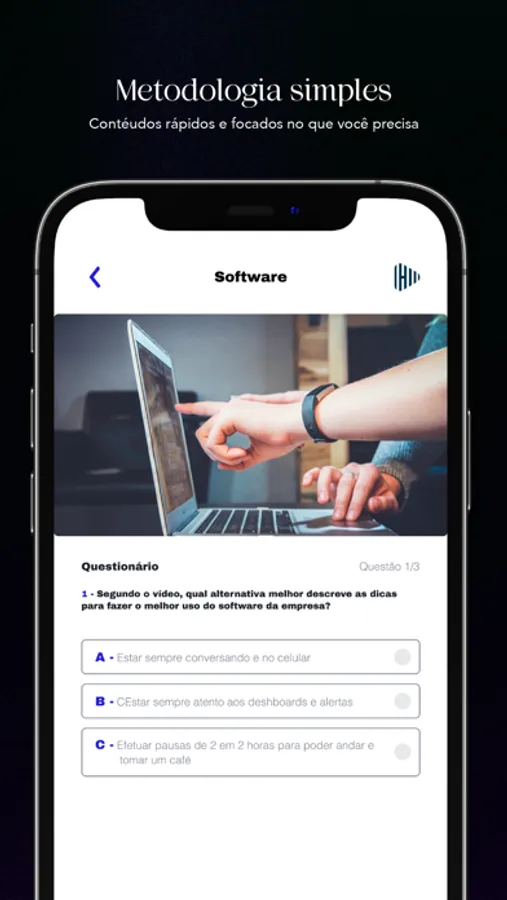 Após visualizar as aulas, os usuários respondem questões objetivas para garantir a absorção do conhecimento e que permitem o gestor avaliar a performance de cada participante.