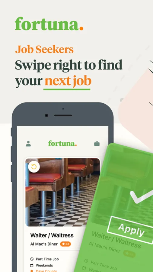 With thousands of open jobs for you to browse with just a swipe, Fortuna makes searching easy. When you’re ready to apply, you can do it digitally on the platform. Swipe, apply, get hired.