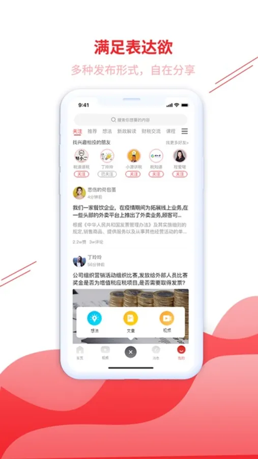税道是一款汇集优质内容和创作者的社交应用。新版本主打想法、文章、视频等模块,在用户分享知识的同时也可以志同道合的人,建立独属于自己的税务小圈子!