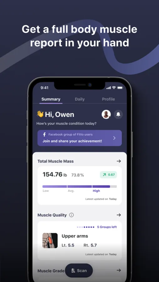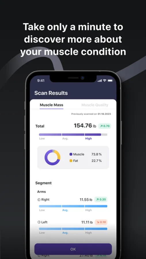 • Track your muscle condition: Muscle Mass, Muscle Quality and Muscle Grade.