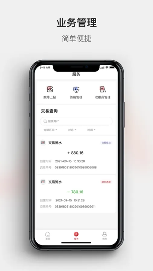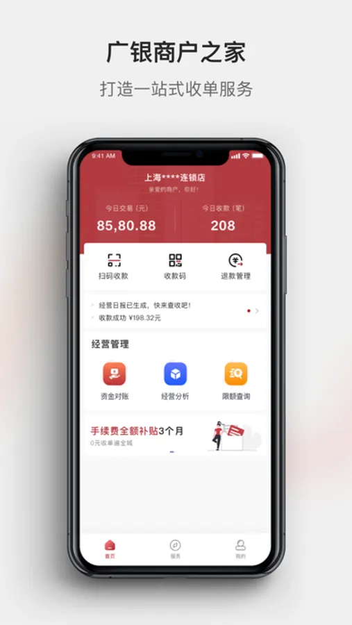 广银惠收银APP可以帮助商户实现移动收单和日常经营管理的线上化、标准化和流程化,为合作商户提供一站式收单服务。商户可通过本APP进行日间经营的收银管理、资金对账和经营数据分析,操作简单便捷。