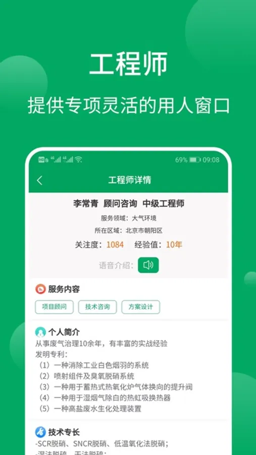[工程师]集成环保细分领域的工程师及用工资源;包含水环境、大气环境、环境修复、环境监测、低碳节能、固废资源化、噪声治理等领域的专业工程师人才,提供顾问咨询、项目设计、安装调试三大类服务,即时获得专业有效的解决方案。