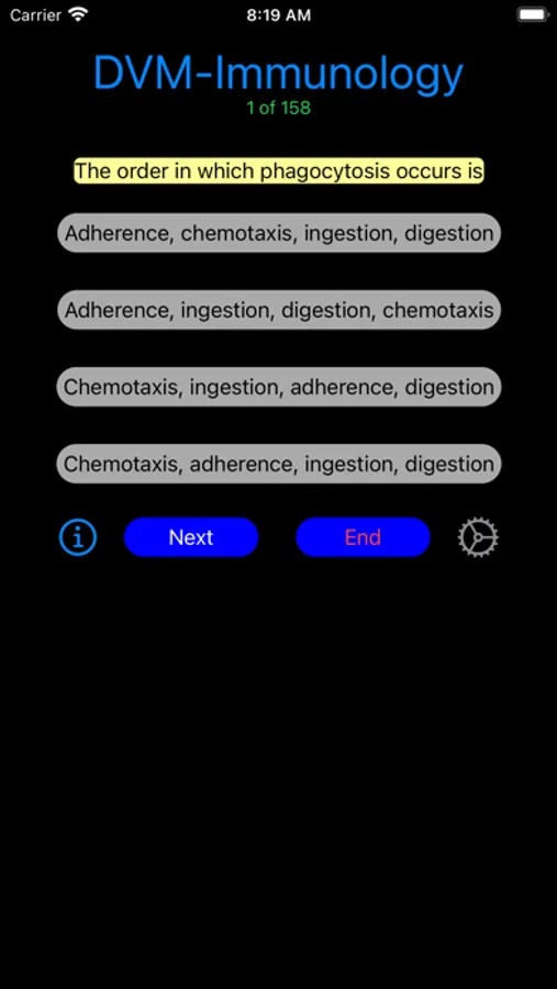 Test mode. Configurable number of questions, picked at random. Stores your score.