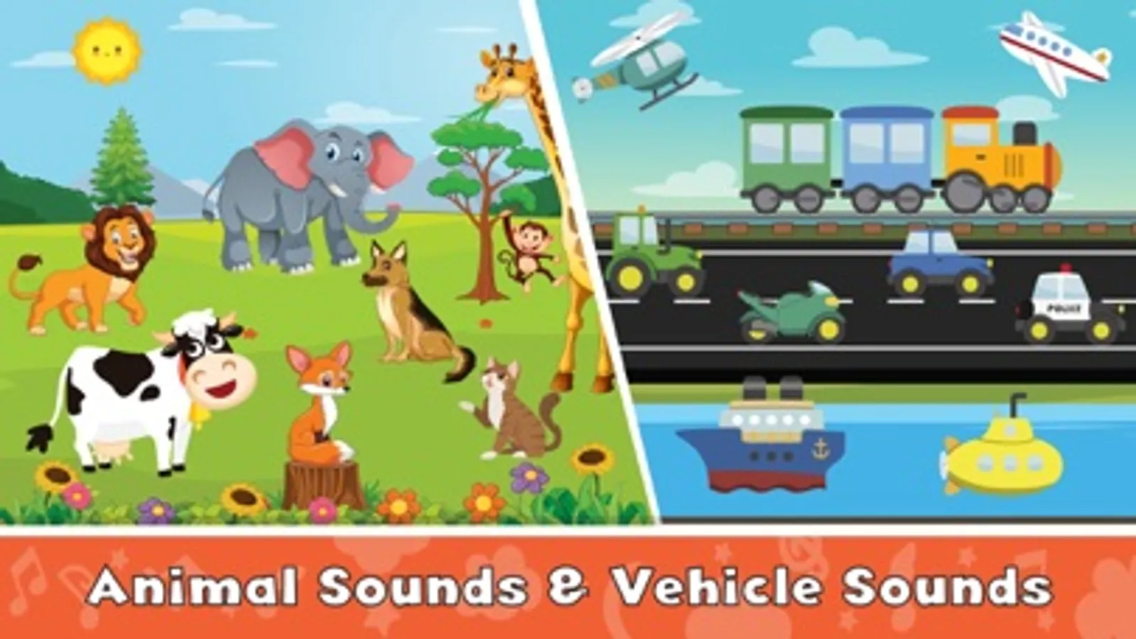 – Colorful musical game to learn animal sounds, vehicle sounds, and funny sounds to keep them interested