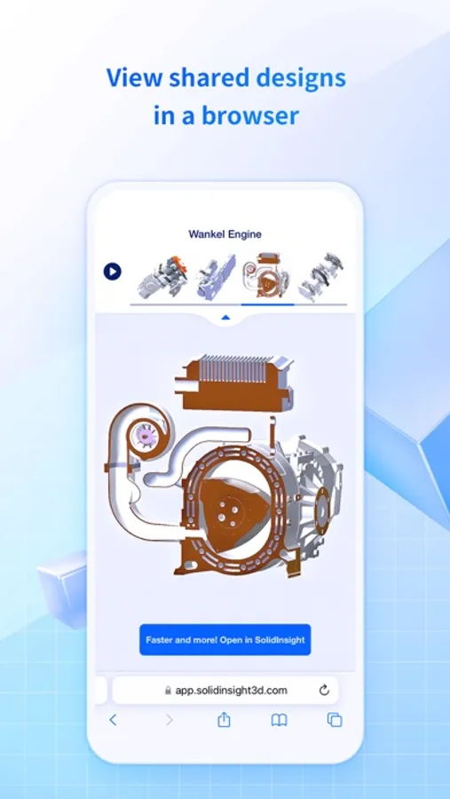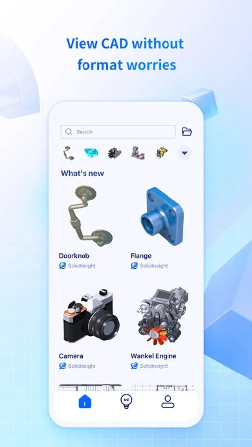SolidInsight on your phones or tablets assists you to instantly view 3D models and 2D drawings without expensive CAD editors or heavy computers. Whether you are reviewing designs with your team on the road, showing off your products to potential customers at a tradeshow, collecting design feedback from a client on a job site, or guiding a supplier on a factory floor, 3D at your fingertips gives you immediate CAD access, intuitive visual insights, and accurate properties such as mass, bounding box sizes, volumes, and other meta data. Beyond handy viewing, you can also measure models to obtain vital dimensions, capture views for quick revisits and 3D presentations, and share comments and measurements to collaborate efficiently.
