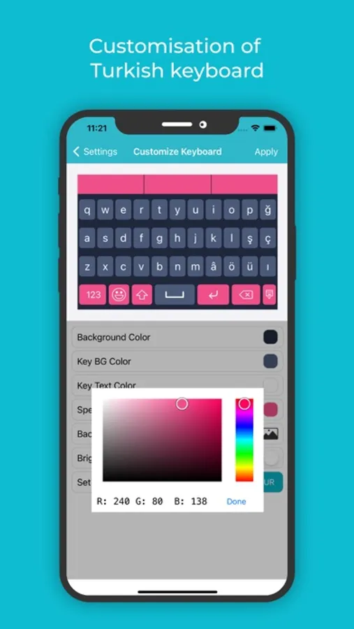 • Change colours for the Background colour, Key background colour, Keyboard text colour, Suggestion box colour etc, so that typing does not seem boring and monotonous with this Turkish keyboard for iOS.