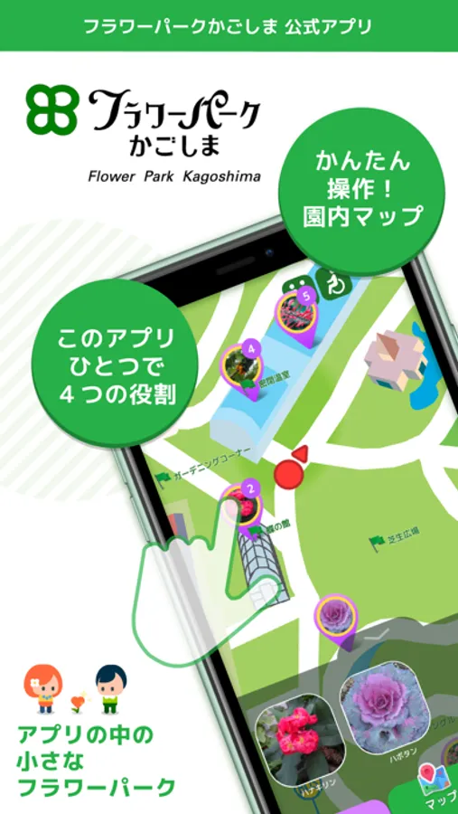 園内マップを使って、フラワーパークをより楽しく移動しましょう。GPSで現在位置を表示したり、見ごろの花の咲いている場所を確認することができます。画面上の見ごろの花をタップすれば、詳しい情報を知ることもできます。