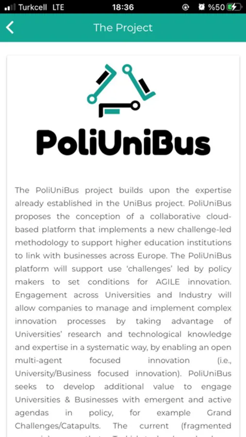 PoliUniBus proposes the conception of a collaborative cloud-based platform that implements a new challenge-led methodology to support higher education institutions to link with businesses across the Europe. The PoliUniBus platform will support use ‘challenges’ led by policy makers to set conditions for AGILE innovation.